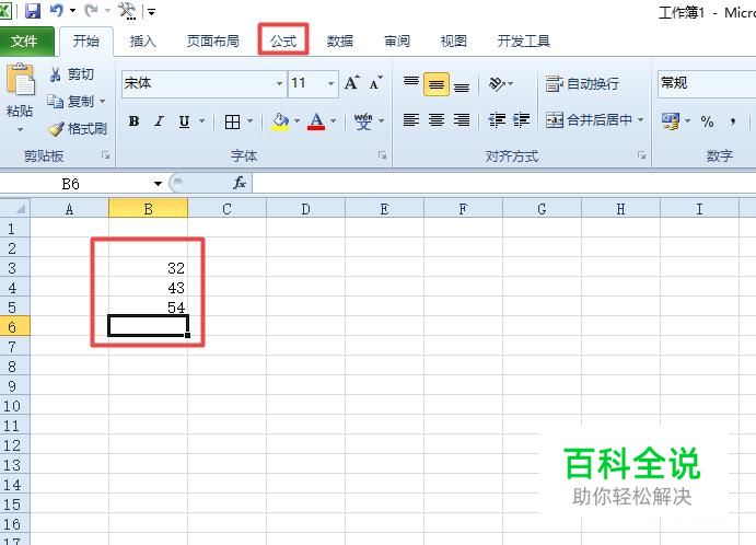 首先,我们打开我们电脑上面的excel,然后我们在里面输入一些数字,之后我们选中图示中的单元格,然后点击公式;