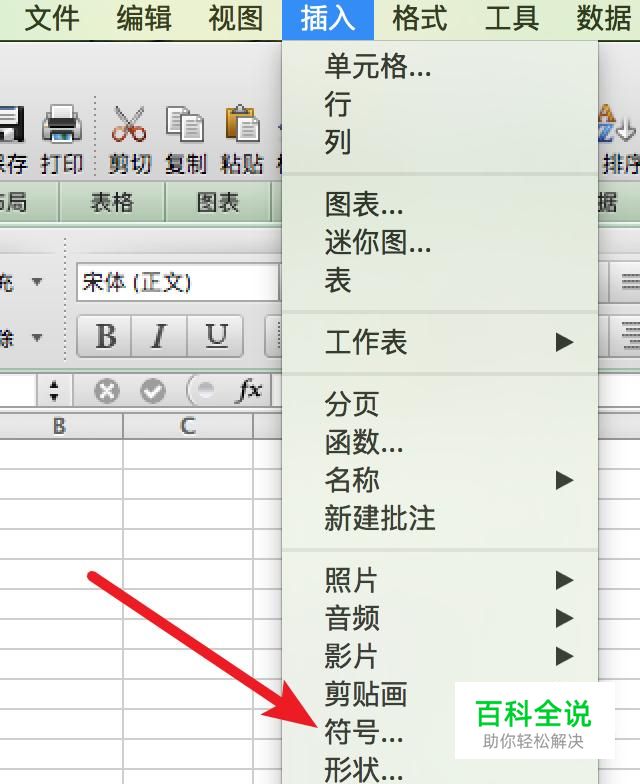我们先点击菜单栏上的‘插入’,然后在子菜单上点击‘符号’。