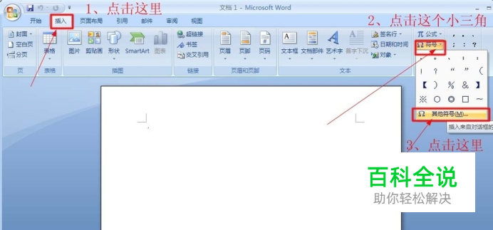 打开word2007,点击word上面菜单栏的“插入”。再点击“符号”后面的小黑三角。在下拉菜单中选择“其他符号”。