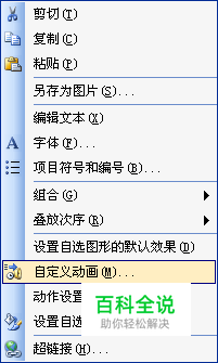 按快捷键【CTRL+A】选中要闪烁的文字,在选中的文字上单击鼠标右键,在下拉菜单中选择【自定义动画(M)…】命令,在出现的【自定义动画】中单击【添加效果】命令,如下图所示: