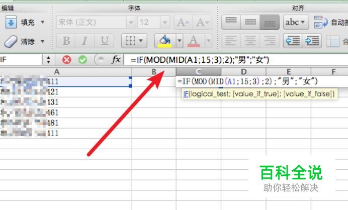 在C1单元格里输入公式:=IF(MOD(MID(A1;15;3);2);"男";"女") 解析一下,MID函数是取字符串的其中一些字符,公式里表示从第15位开始,取后面的3位。然后通过MOD函数来取得这3位数除2的余数,如果余数为0,即能整除,则为男性,否则为女性。