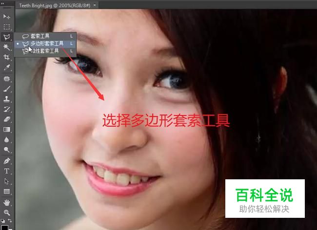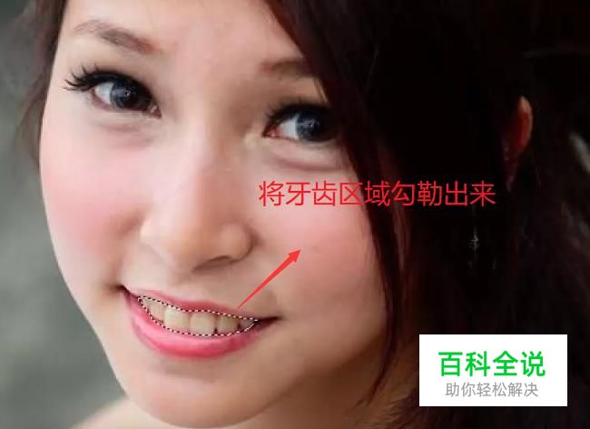 接下来用多边形套索工具将牙齿的区域勾勒出来,加载进选区,如下图所示