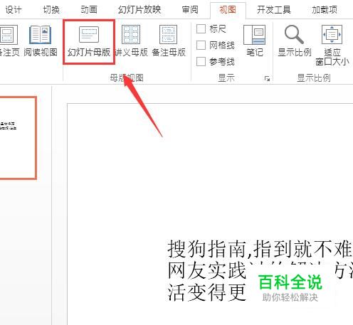 打开PPT之后我们找到视图菜单,点击该菜单在其内找到幻灯片母版选项,如图所示: