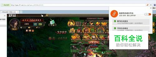 当你进入页游之后,点一下地址栏右边的图标,你会看到防掉线的提醒:已经进入游戏,建议开启防掉线功能。这个时候只要点一下右边的开关,就可以开启防掉线功能了。——没错,就是这么简单。