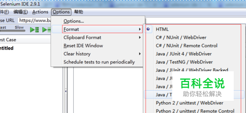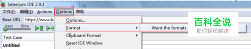 【步骤二】现象-没有format选项 打开Selenium IDE后->点击Option->Format,发现没有转换脚本选项可选,如下图