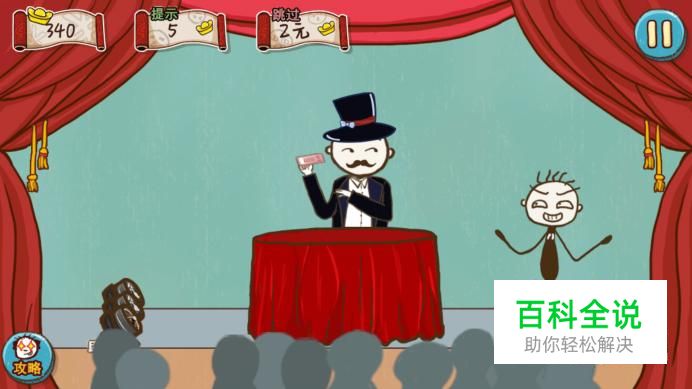 第九关:魔术。 先让史小坑把钱给给魔术师,再点击右边伪装成灯的电风扇,将魔术师的裤子吹掉赶走魔术师就可以了。