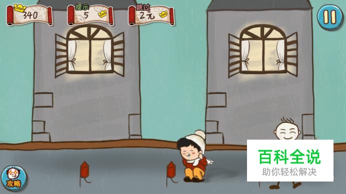 第十一关:烟花。 先点燃最右边的烟花,再往左边倾斜,让烟花飞到房子中间就可以了。