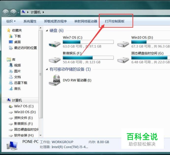 首先,请大家打开Win7系统中的计算机界面,选择打开“控制面板”选项。