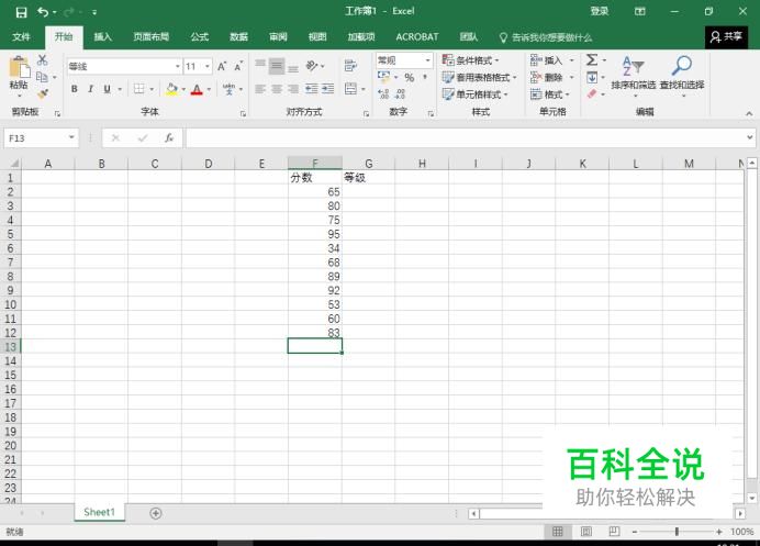 打开保存有分数的表格,如图所示。这里假设分数设为 A:90分以上(含90) B:80~89 C:70~79 D:60~69 E:60以下(不含60)