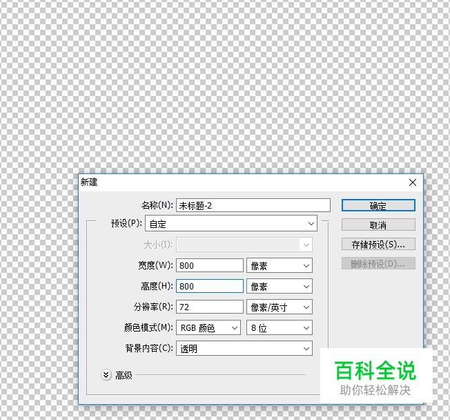 新建一块画布,画布的大小设置为800*800,背景色为透明色。