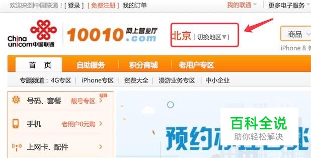 打开中国联通官方网站后,先点击页面头部的地区,先切换到你所在的省市。