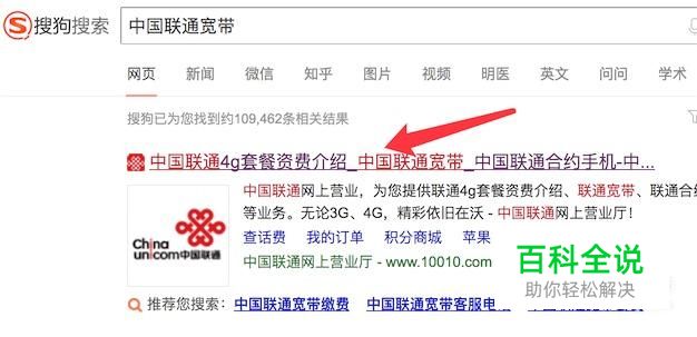 打开搜狗搜索,输入:中国联通宽带,搜索到结果,点击打开第一个