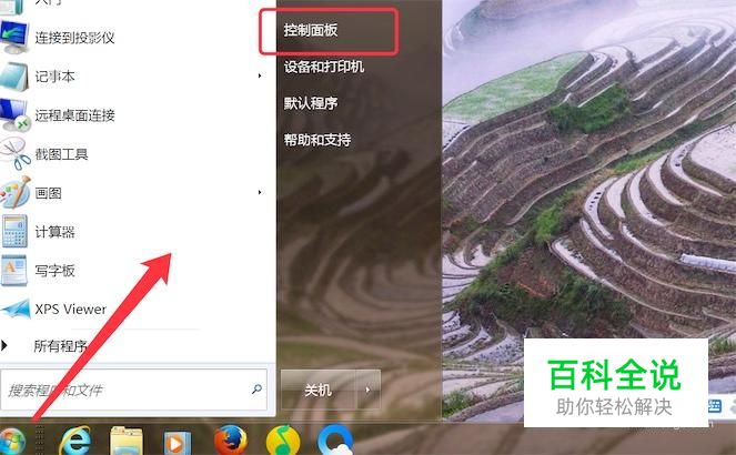点击开始菜单,弹出菜单后,点击上面的‘控制面板’
