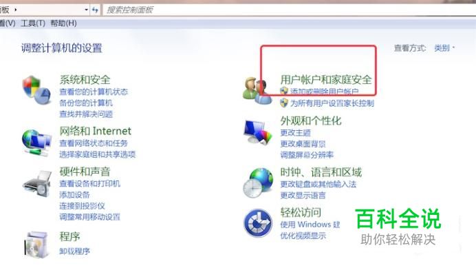 在控制面板上,点击打开‘用户账户和家庭安全'