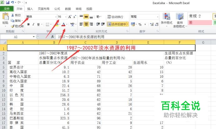 打开要处理的工作表,选中第一行标题,把字体调整为16号,颜色为红色。