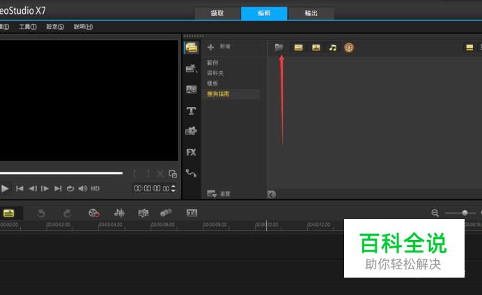 打开会声会影x7软件,在右侧素材框里,点击文件夹图标,把照片导入到素材窗口。