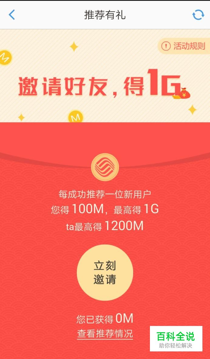 邀请好友下载登录"四川移动和生活",推荐成功100M,一个月最多1G。