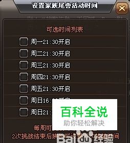 每个家族的族长,可以在家族面板处点击家族BOSS。并可以在【设置家族尾兽活动时间】面板设定本周本家族的家族尾兽活动时间。每个家族每周可以和二尾进行两次练习。2次挑战结束后,族长可设置下次挑战时间。 温馨提示:该活动时间一经设定不可修改,请族长注意选择时间。该操作只能由族长完成。