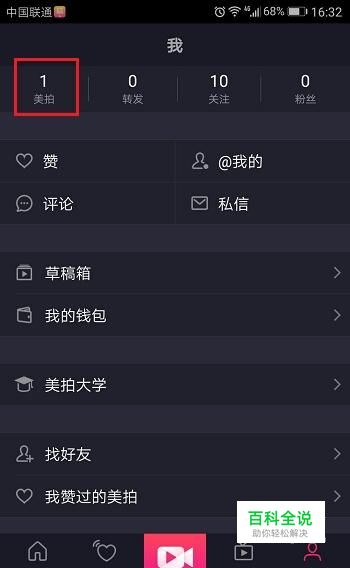登录成功过后点击屏幕下方的“我”,可以看到有“美拍”这个选项,下面标注的数字是自己录取的视频数量,再点击“美拍”