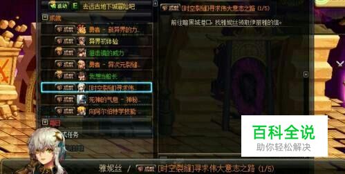 地下城的寻求伟大意志之路一共有五个任务,在第一个任务中玩家前往暗黑城港口,寻找雅妮丝拿到伊利娅交给她的一封信,看完信后和雅妮丝对话,然后去到另一个世界。