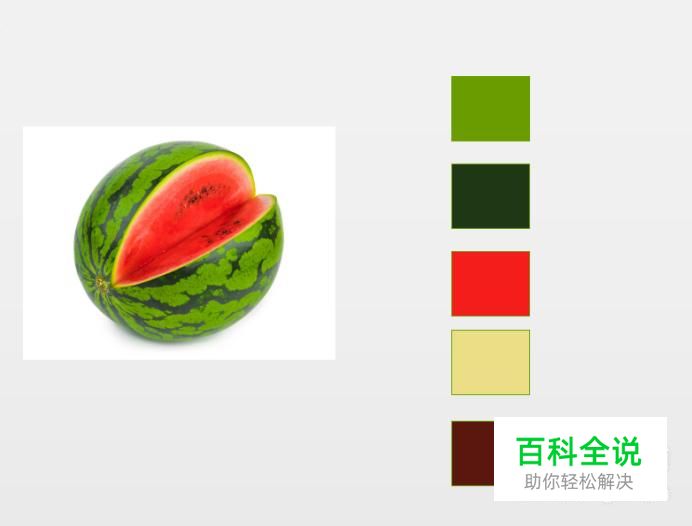 首先我们在网上找一张西瓜的图片,分析一下它的配色。如图所示。我们主要取瓜皮的绿色,瓜皮和果肉之间的米白色,果肉的红色,以及瓜籽的黑棕色。