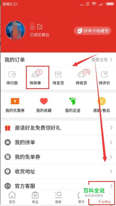 打开拼多多app端,在窗口右下角有一个“个人中心”按钮,点击它打开如下窗口; 在此窗口中如果购物成功后,这时在顶部的“待拼单”选项卡上会有拼单订单数量。