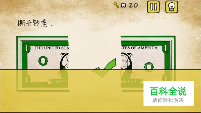 第九关,撕开钞票,我们用两只手指分开钞票即可。