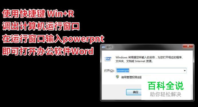 使用快捷键 Win+R ,调出计算机运行窗口。 在运行窗口输入powerpnt ,即可打开办公软件Word。
