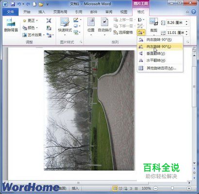 2.应用Word2010预设旋转效果 Word2010预设了4种图片旋转效果,即向右旋转90°,向左旋转90°,垂直翻转和水平翻转,操作步骤如下所述: 第1步,打开Word2010文档窗口,选中需要旋转的图片。 第2步,在“图片工具”功能区的“格式”选项卡中,单击“排列”分组中的“旋转”按钮,并在打开的旋转菜单中选中“向右旋转90°”、“向左旋转90°”、“垂直翻转”或“水平翻转”效果,如图2010062404所示。图2010062404 选中“水平翻转”效果