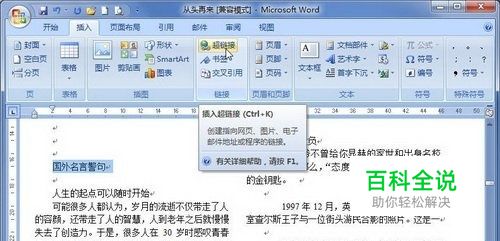 第1步,打开Word2007文档窗口,选中需要创建书签超链接的文字。切换到“插入”功能区,在“链接”分组中单击“超链接”按钮,如图2011110714所示。 图2011110714 单击“超链接”按钮 小提示:用户也可以将插入条光标移动到合适的位置而无需选中文字,然后直接在“链接”分组中单击“超链接”按钮。