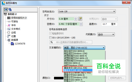 2、双击条码对象,将打开的条码属性对话框切换至“符号体系和大小”选项卡,将文本编码设置为“简体中文”。