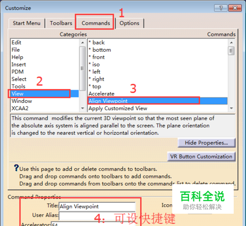 在弹出的"Commands(命令)"窗口,先点击左边栏的"view(视图)",然后在右边栏中找到命令"Align Viewpoint(对正视图)",可双击在下面设置快捷键。