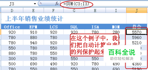 然后选中需要保护的单元格,在这个例子中是整个“总合”这一列(因为这一列是自动计算出来的),把它的 锁定勾上。 易宝典提示:为方便起见,你也可以只把需要编辑的那部分单元格的锁定取消掉。
