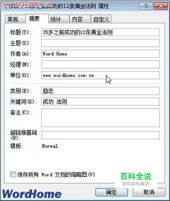第2步,在打开的文档属性对话框中切换到“摘要”选项卡,分别输入作者、单位、类别、关键词等相关信息,并单击“确定”按钮即可,如图2009121215所示。 图2009121215 输入Word文档属性信息
