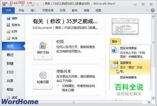 用户通过设置Word文档属性,将有助于管理Word文档。在Word2010中设置Word文档属性的步骤如下所述: