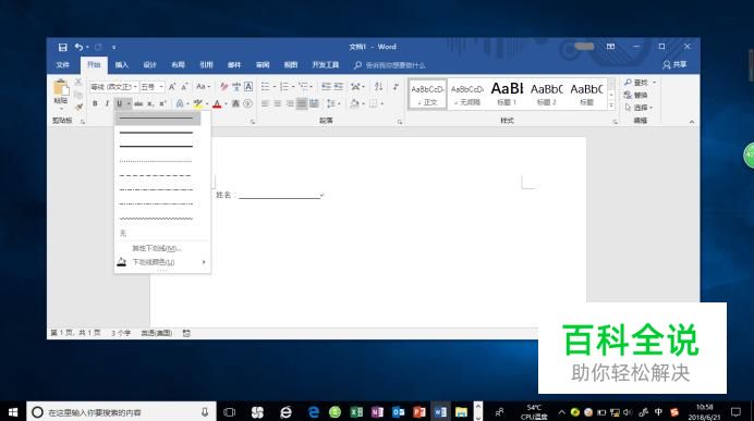 如图所示,选择"开始→字体"功能区。点击"下划线"图标向下箭头,弹出下拉列表选择添加下划线。