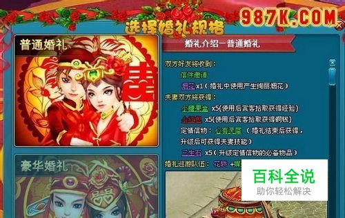 婚礼规格 目前开放两类婚礼规格,【普通婚礼】和【豪华婚礼】,不同婚礼规格获得的物品不同。
