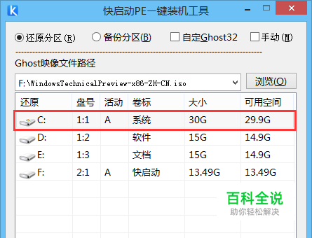 在弹出的快启动pe一键装机工具中,在“浏览”处选择win10镜像,并以c盘做为系统盘。如图:
