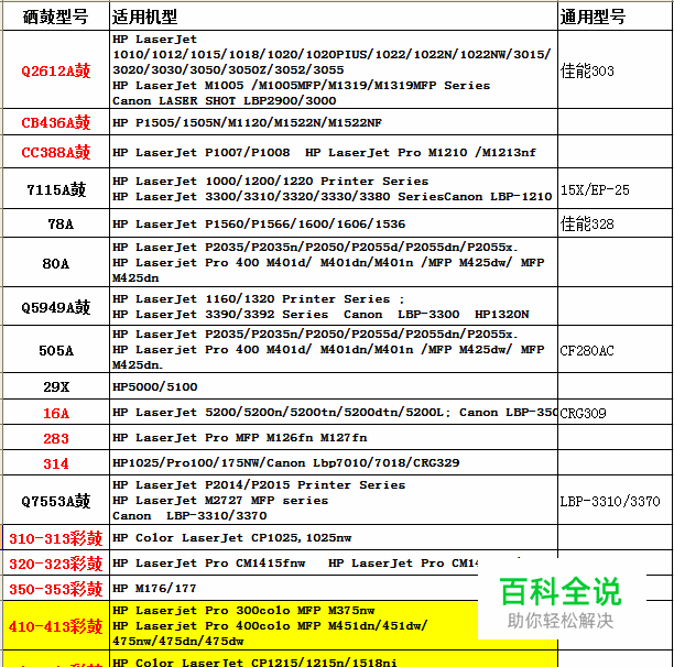 HP打印机硒鼓型号对照表