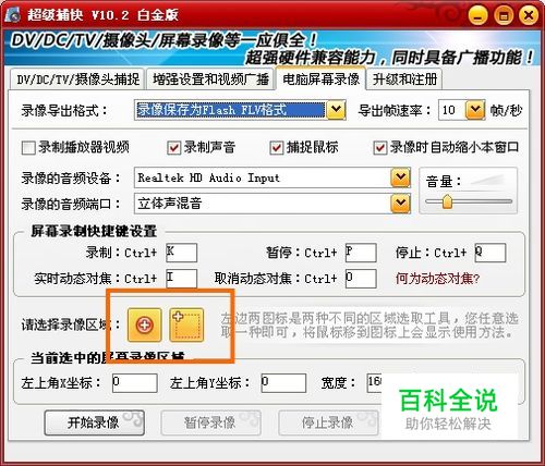 选择录制视频区域和录制格式 通过中部的请选择录像区域旁的两个橙色按钮,可以自由选择录制视频区域,红色加号按钮可以通过拖拉直接选择一个窗口,旁边的小加号可以自由定义。要是你想要录制的不是整个窗口,可以通过小加号按钮,自定义拉框,不要选择到自己不需要的部分就行了。可谓目前最全面灵活的录制区域选择方式。