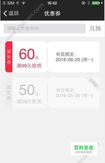 然后在杂合理你就可以看到你的优惠券信息,小编有一张减免券,满99元可可以见面60 ,有效期至2016年6月20号!小伙伴们在购物的时候就可以使用你的优惠券啦!