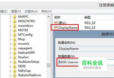 在窗口右侧查看其DisplayName键值是NDIS Usermode I/O Protocol,如果有缺损的话,可以自己新建一个;