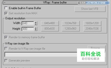 VRay帧缓冲器(Frame buffer)当激活时,VRay帧缓冲器就取代了Max虚拟帧缓冲器(virtual frame buffer).VRay帧缓冲器有着更加多的选项来显示处理图像和许多有趣的选项.在这个卷展栏里你可以取消"get resolution from max"的勾选来控制清晰度的大小."Render to V-Ray raw image file"选项能让你渲染一个非常高清晰度的图像,而没有占用完可用的内存.VRay帧缓冲器的使用是仅适合于高级VRay用户的.若你刚接触VRay,不必费心在这里.