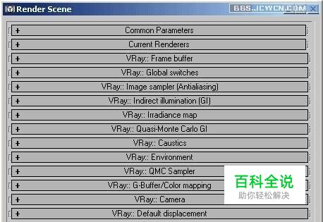 额外的卷展栏 在设置VRay为主渲染器后,你会注意到一堆新的卷展栏.每个卷展栏在其名称之前都有"VRay:"的字样,VRay的渲染设置就充满在其中了...下一步将大致讲述每一个卷展栏.