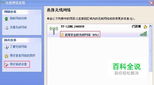 在无线网络连接中查看无线网络,观察搜索到的无线网络是否进行了加密设置。下图为一个WPA加密的无线网络。