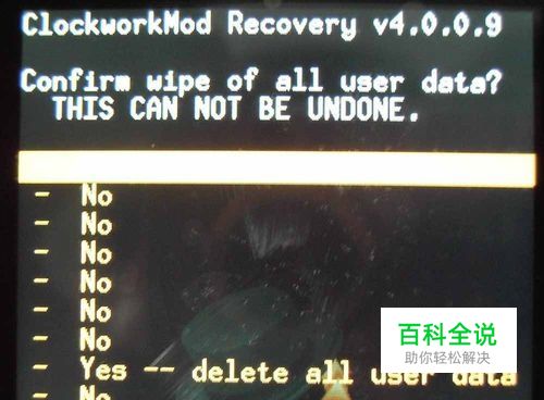 3)按HOME键执行wipe data/factory reset命令后再用音量下键选择下图中Yes -- delete all user data并按HOME键执行命令。