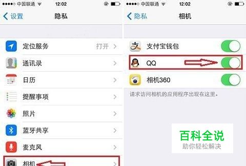 二、进入iPhone隐私设置后,我们再进入“相机”设置,之后在相机了找到QQ选项,将其开关打开即可,如下图所示: