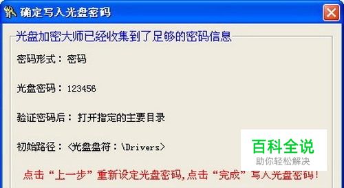 第3步,打开“确定写入光盘密码”对话框,确认设置正确后单击“完成”按钮设置光盘密码,如图2009020457所示。 图2009020457 确认设置光盘密码