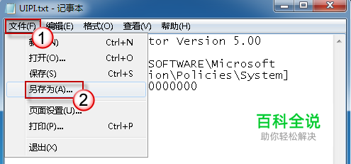 然后,将此文件命名为 UIPI.reg保存。具体如下图所示: