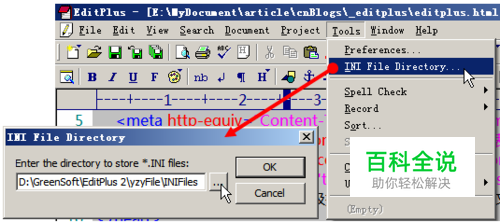 设置EditPlus的配置文件路径 因为EditPlus是可以绿色使用的(直接解压那个EditPlus压缩包文件即可直接使用,不用安装),所以,当我们对EditPlus进行一系列的配置以后,保存下这些配置文件。以后当我们重装系统,或者换台电脑使用的时候,只要重新加载一下那些配置文件,以前的配置就都重新回来了,很是方便。所以,在讲其他配置和技巧之前,我们先设置好EditPlus的配置文件路径。 打开EditPlus → 【Tools】→ 【INI File Directory...】 → 在弹出的对话框中设置配置文件的保存位置(压缩包内的配置保存文件在解压目录下的"yzyFile\INIFiles"目录下)。这里你可能要重新设置一下目录,因为,我喜欢把EditPlus放在"D:\GreenSoft\EditPlus 2"下(把所有的绿色软件装在一个目录下,每次重装系统的时候,可以直接把绿色软件拷回去,就能直接使用了,从而避免了每次都安装那么多软件)。所以,就请你重新设置一下,根据你的习惯,把配置文件存放在某个目录下吧。